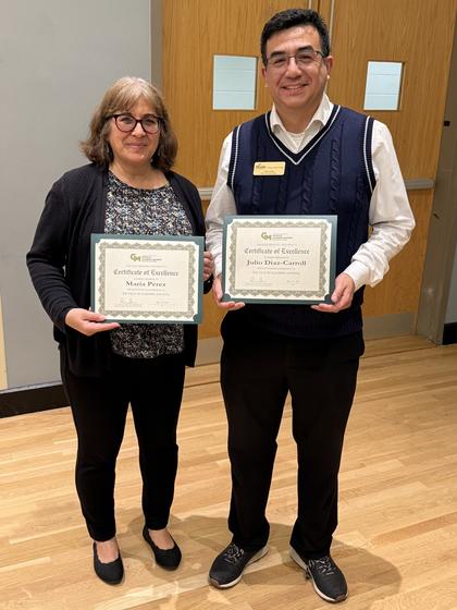 Julio Diaz-Carroll, academic advisor, and Maria Perez, associate director of undergraduate student success, in the College of Public Health (CPH) Office of Student Affairs have been honored as part of the Top 10 Advisors in this year’s 2025 Academic Advisor Awards. Winners are chosen based on student nominations submitted to the Office of Undergraduate Advising describing the highly impactful role advisors have had in making their George Mason experience positive and their display of care and value for their students.